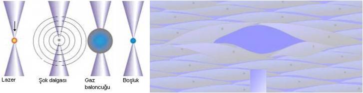 Lazer enerjisi odaklanmış noktada plazma etkisi, şok dalgası, gaz baloncuğu oluşumu sonucunda doku ayrılması ile kesi meydana getirir (photodisruption).