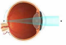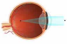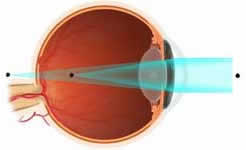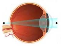 Gözün ön-arka uzunluğu, kornea kırıcılığı ya da her ikisi olması gerekenden fazla ise kırılan ışınlar görme merkezinde değil daha önde odaklanır ve göz uzaktaki cisimleri net göremez. Bu duruma Miyopi denir. Miyoplar; yakını iyi görebildikleri halde, uzağı bulanık görürler. |